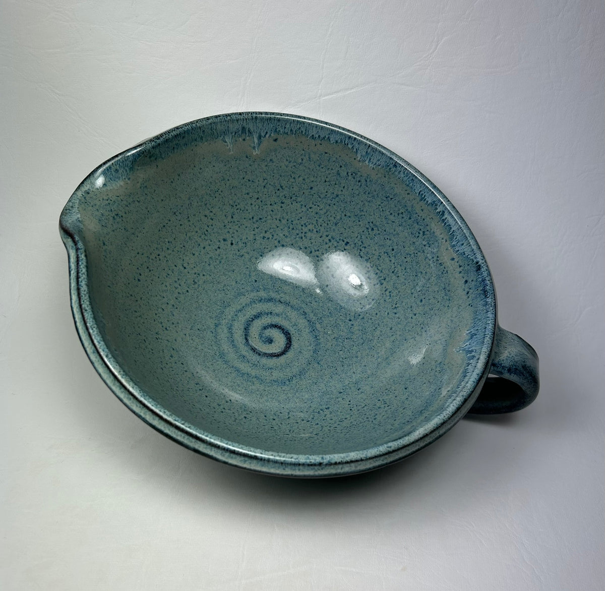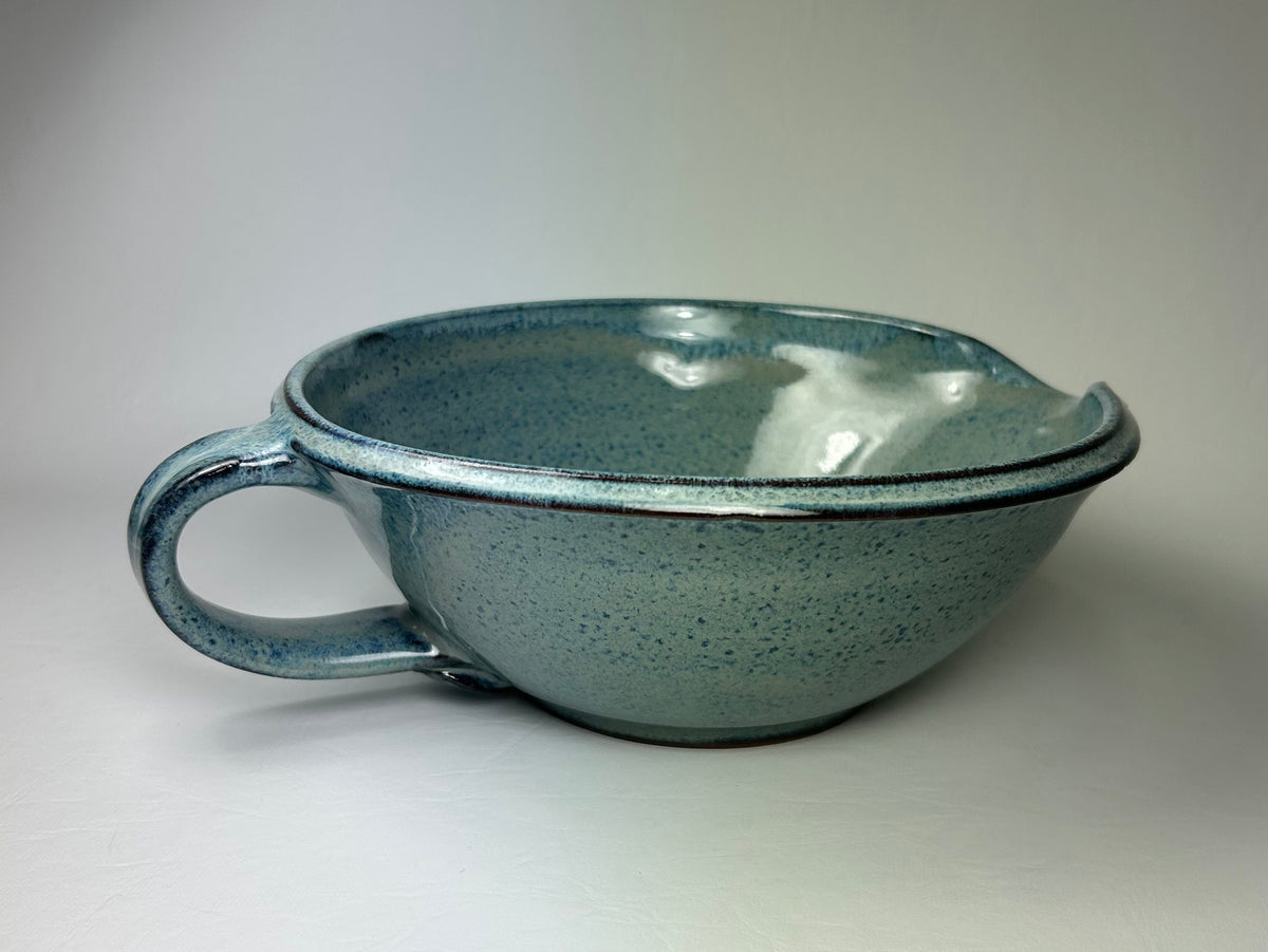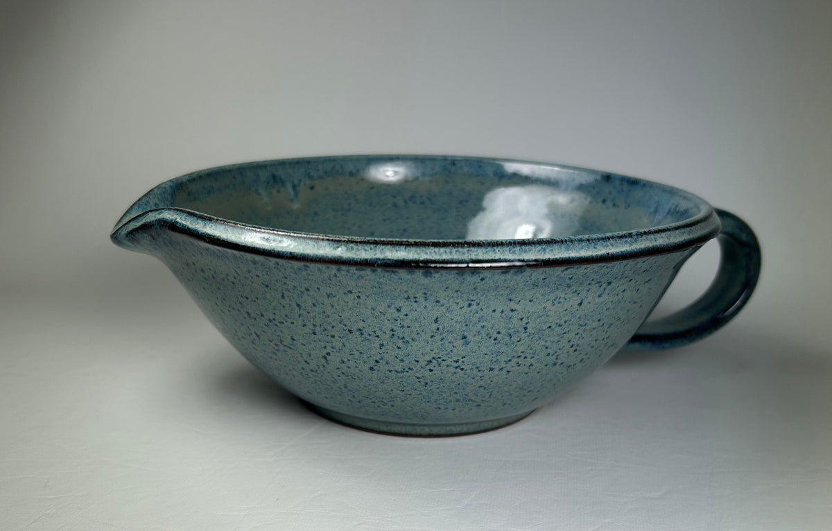 Dark stoneware pouring bowl with handle and pouring lip. 22.5 cm w x 8 cm t