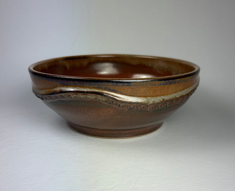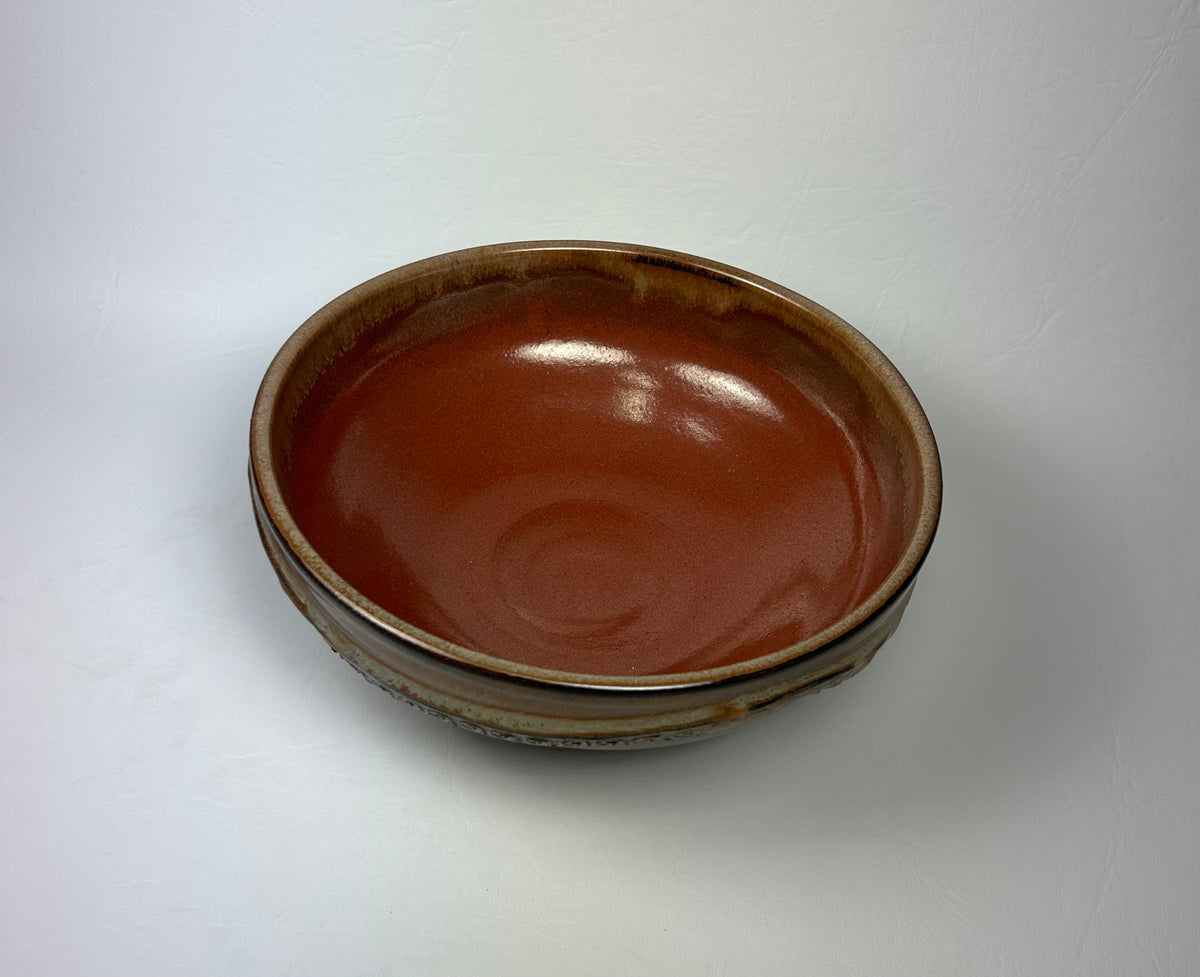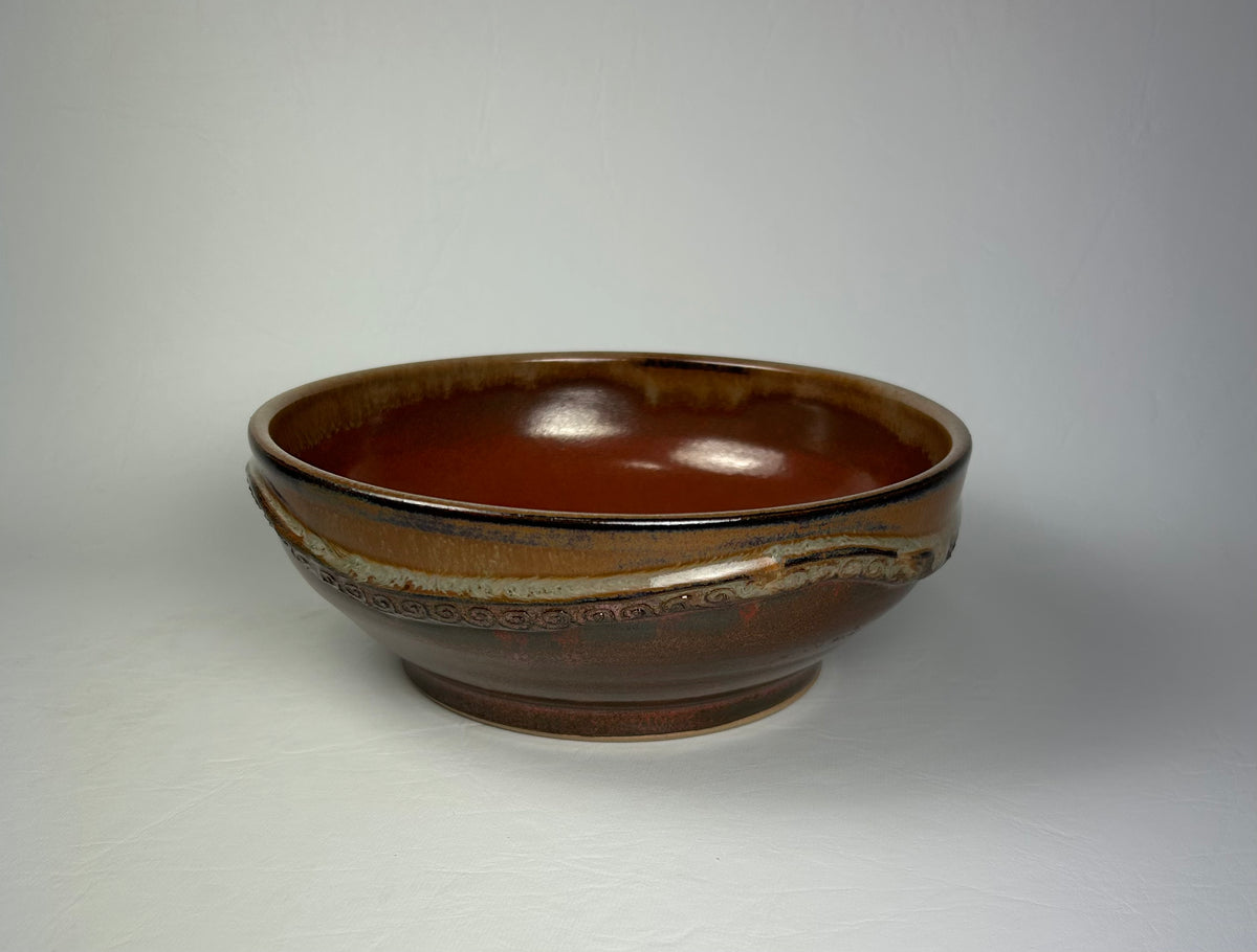 Dark stoneware with undulating textured coil on rim. 18 cm w x 7 cm t