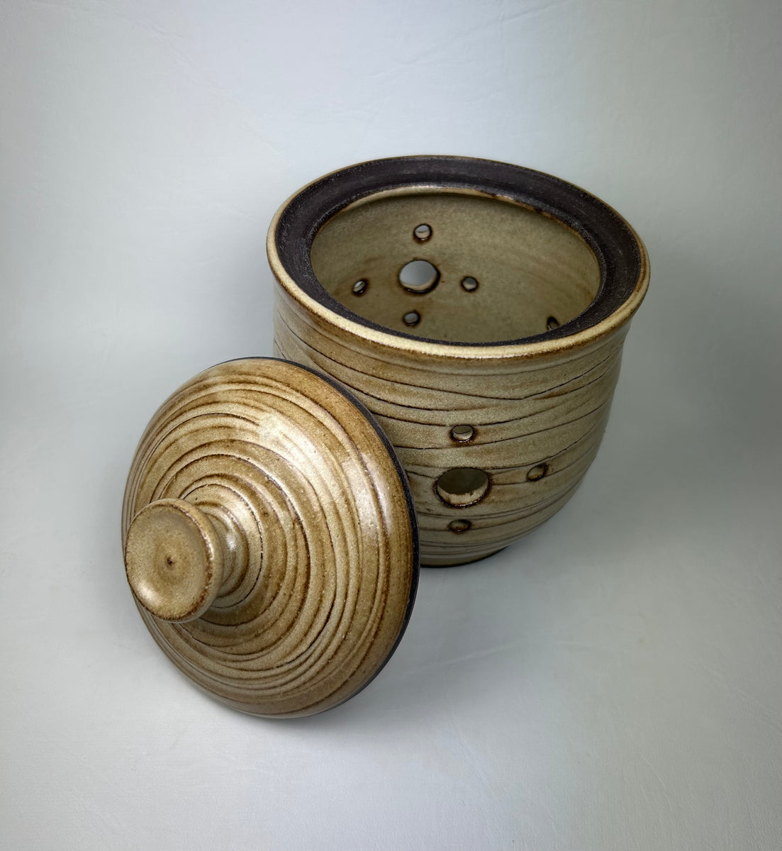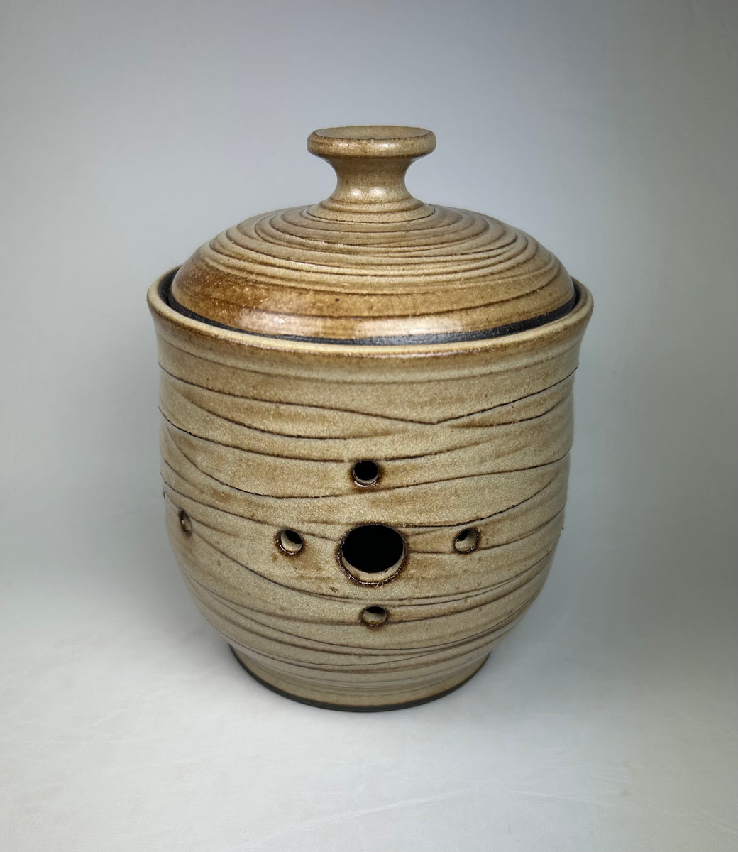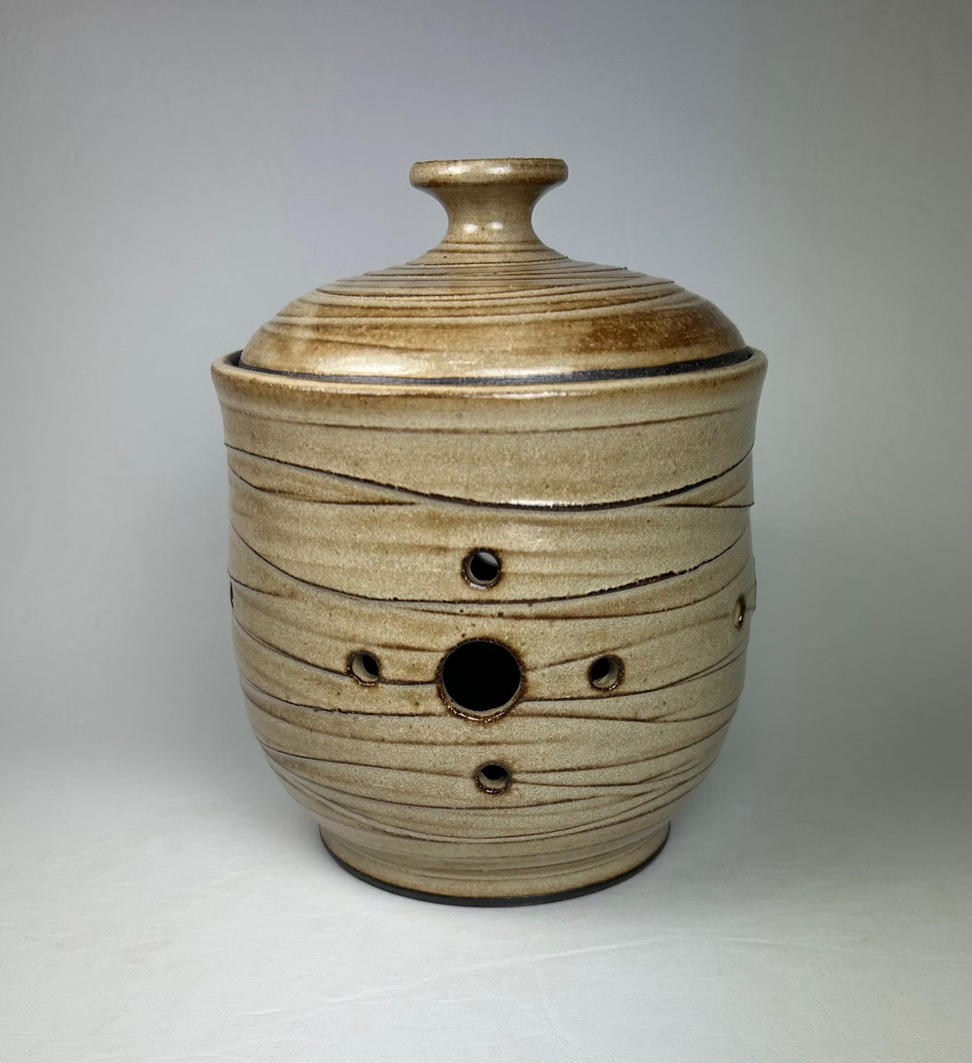 Dark stoneware lidded jar with holes for air and textured surface. 11 cm w x 14.5 cm t