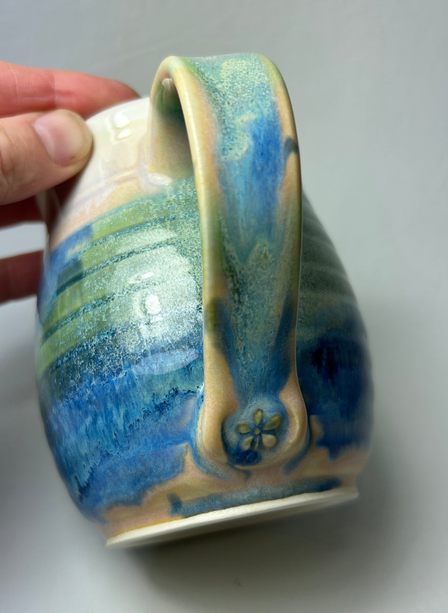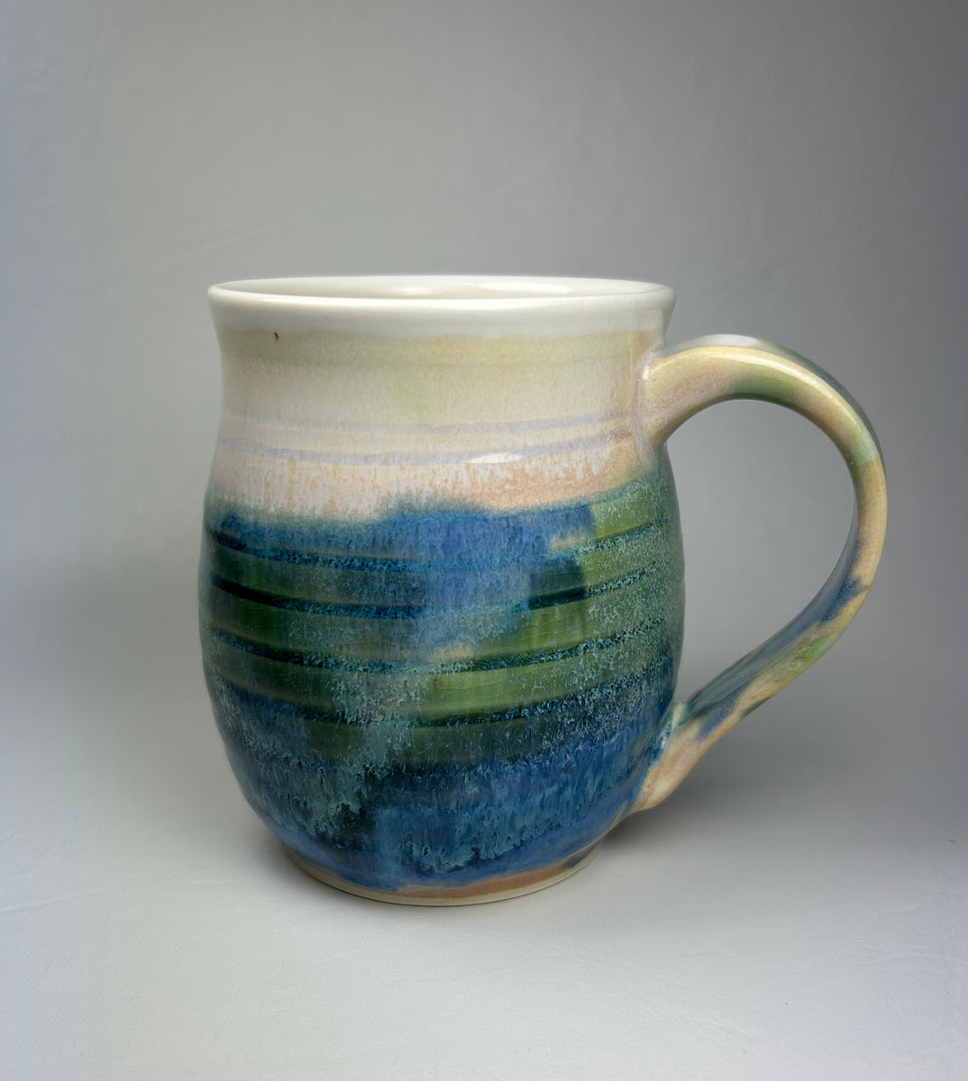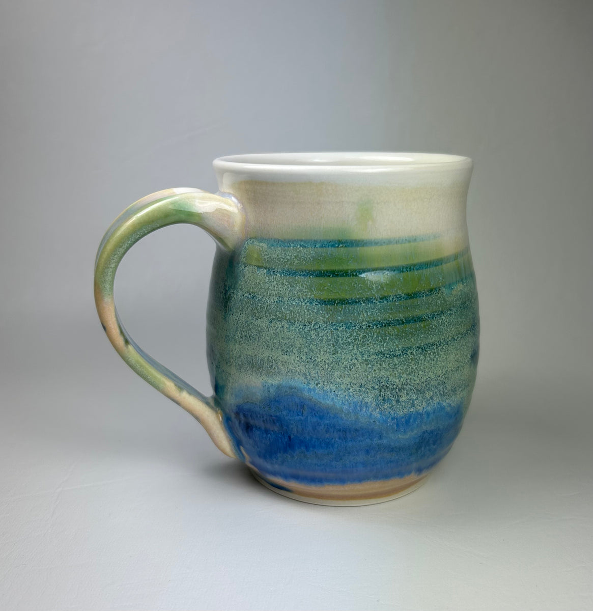 Wheel thrown porcelain mug with incised ring marks. Will hold 14 oz. t: 11 cm x w: 13 cm