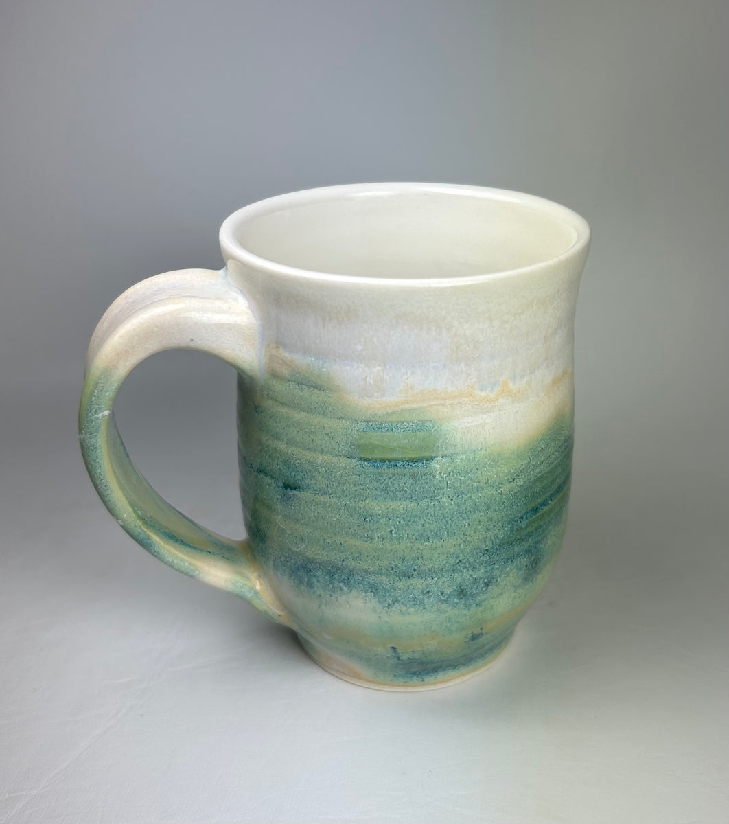 Wheel thrown porcelain mug with incised ring marks. Will hold 14 oz. t: 11 cm x w: 12 cm